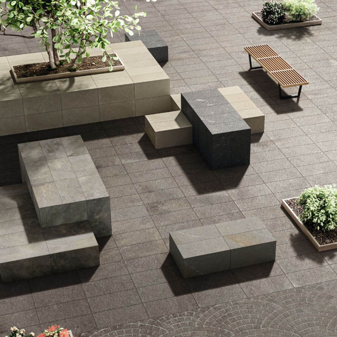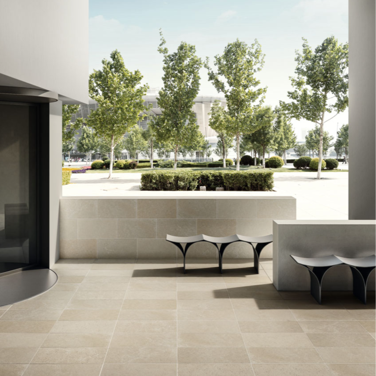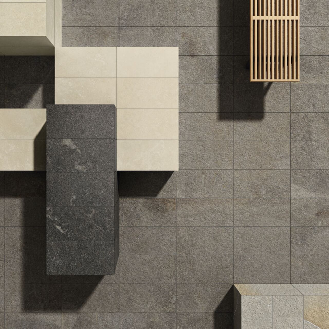 自然石をモチーフにした繊細な柄と色幅が空間に奥行きを与え、住宅から商業施設まで幅広く活躍します。ラフ仕上げによる高い防滑性と耐久性を備え、エントランスや屋外床にも安心してお使いいただけます。