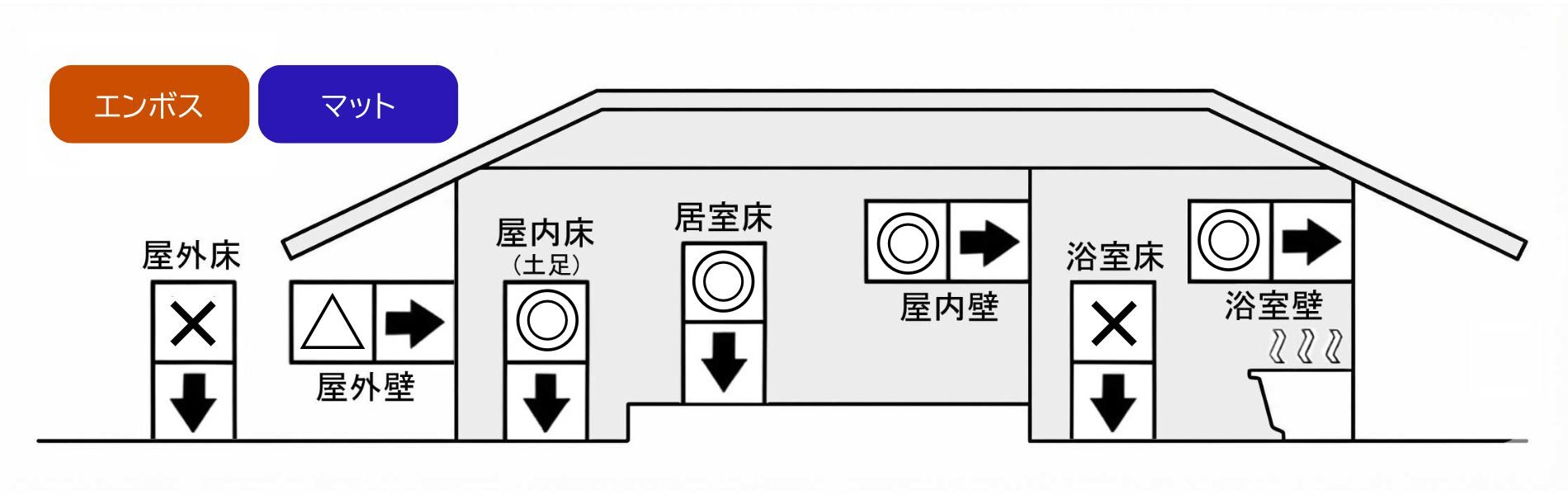 屋内床:改良圧着張り工法、全面接着剤張り工法、NCフィックスプラス工法