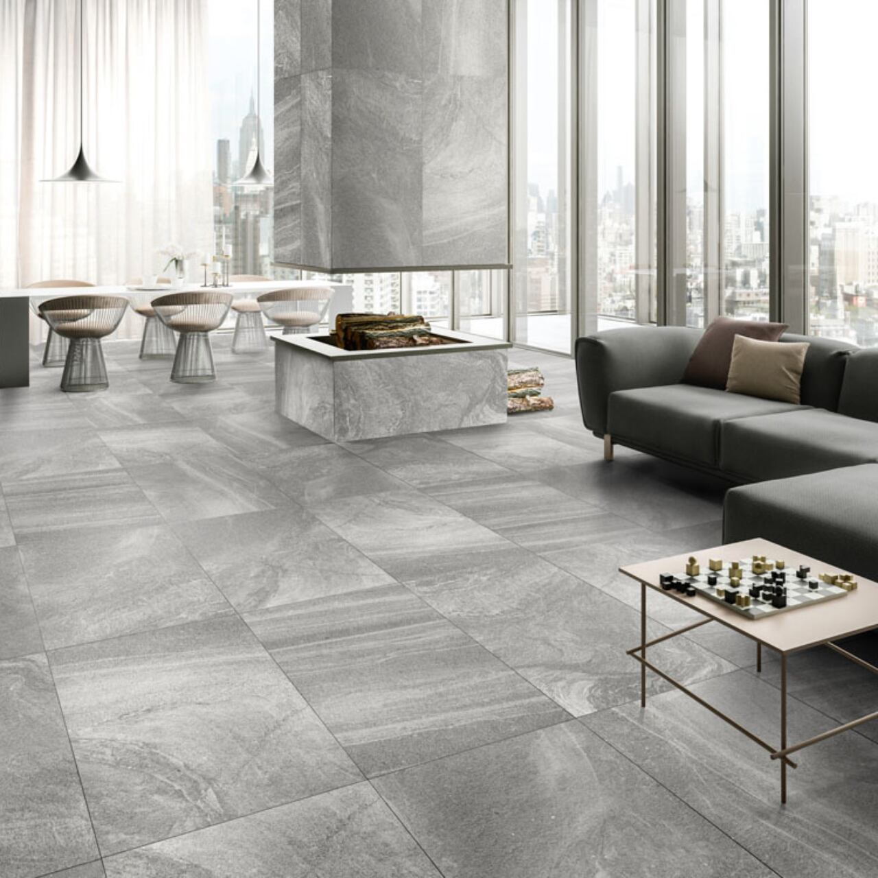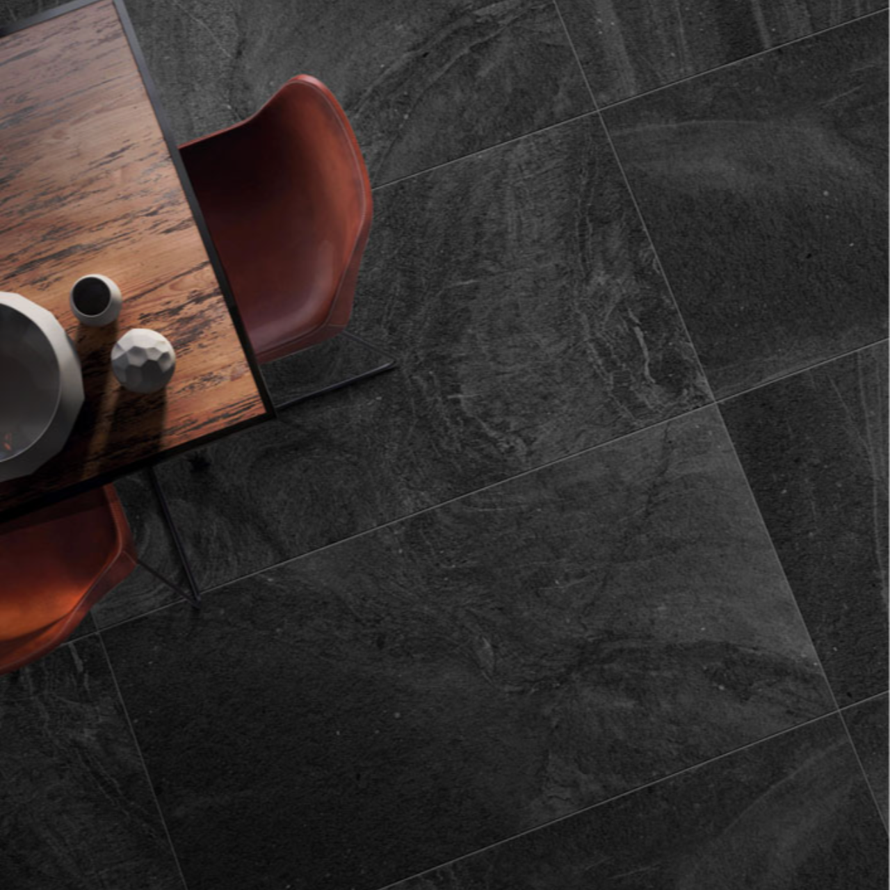 力強い石目模様が空間を引き締め、ホテルロビーや店舗、住宅のリビングなど幅広いシーンで高級感を演出します。600×1200mmの大判サイズが壁面・床面にダイナミックな広がりを生み、モダンで洗練されたインテリアに最適。