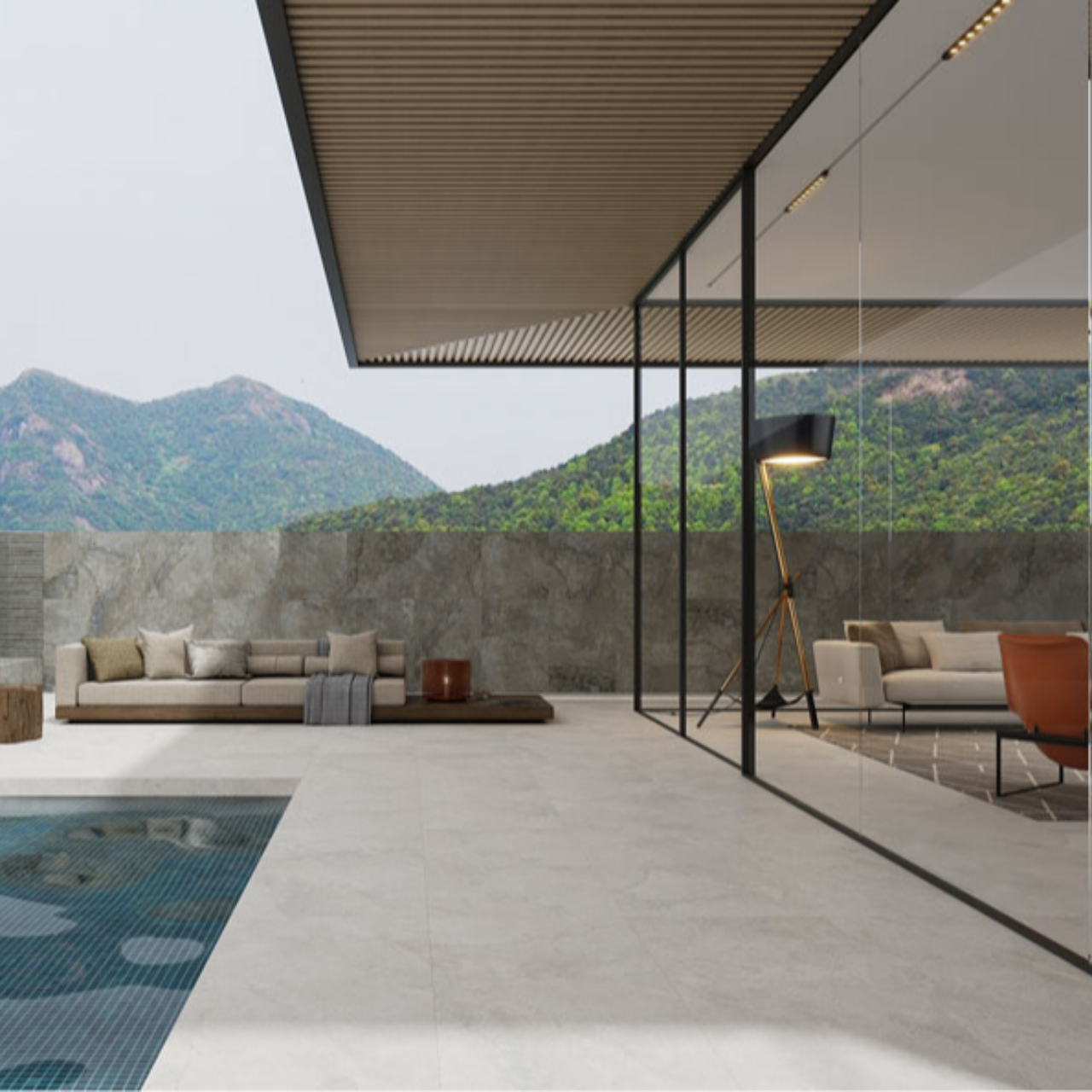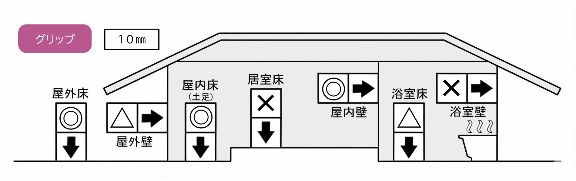 10mmと20mm厚を揃え、屋内床から屋外アプローチ・駐車場まで同じデザインで統一できる高耐久タイル。優れた防滑性を持つグリップ仕上げで、玄関まわりやテラス、商業施設の床にも安心してお使いいただけます。