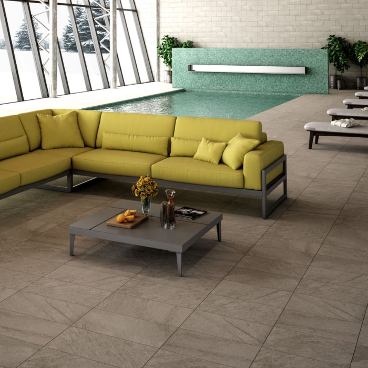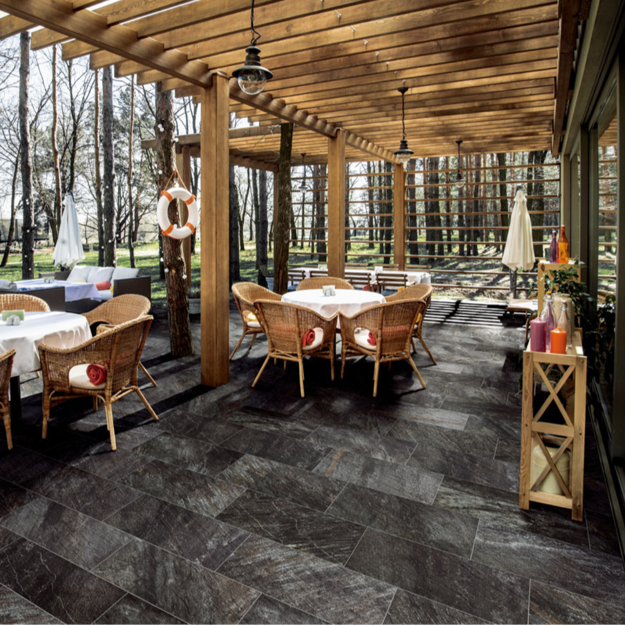 天然石を思わせる深い陰影と表情豊かなパターンが魅力で、住宅から店舗まで幅広い空間に上質なアクセントを与えます。屋内外の床・壁に使用でき、エントランスやテラス、アプローチなど滑りが気になる場所にも最適。耐久性にも優れ、長く美しさを保ちます。