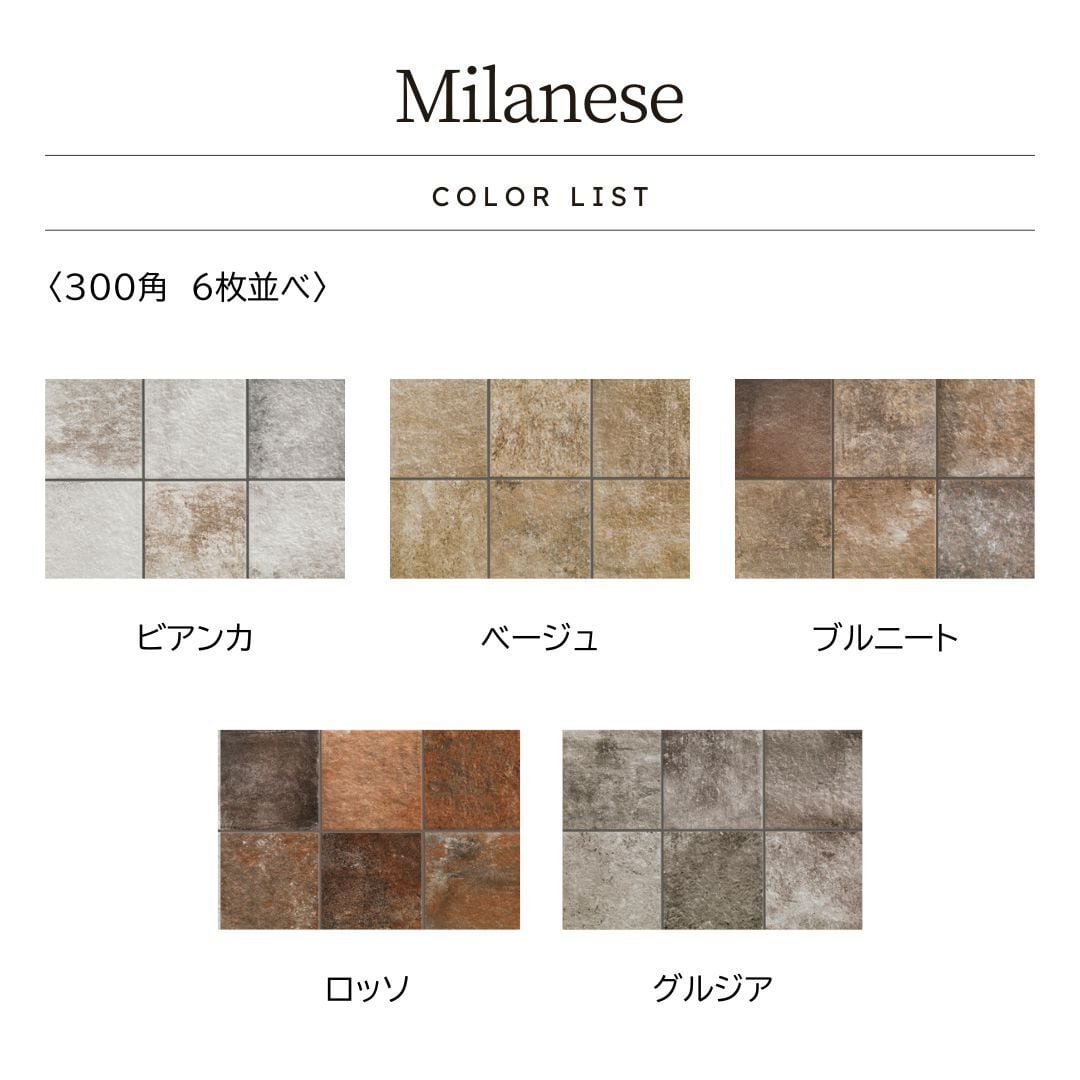 アンティーク感漂うテラコッタ調タイル Milanese(ミラネーゼ)300角(29.8cm×29.8cm)ラフグリップ仕上げ【ケース販売/14枚入り】屋内外床・壁 玄関 テラスに最適|全5色展開 | オンラインタイルショップ ラテラル ~LATERAL~