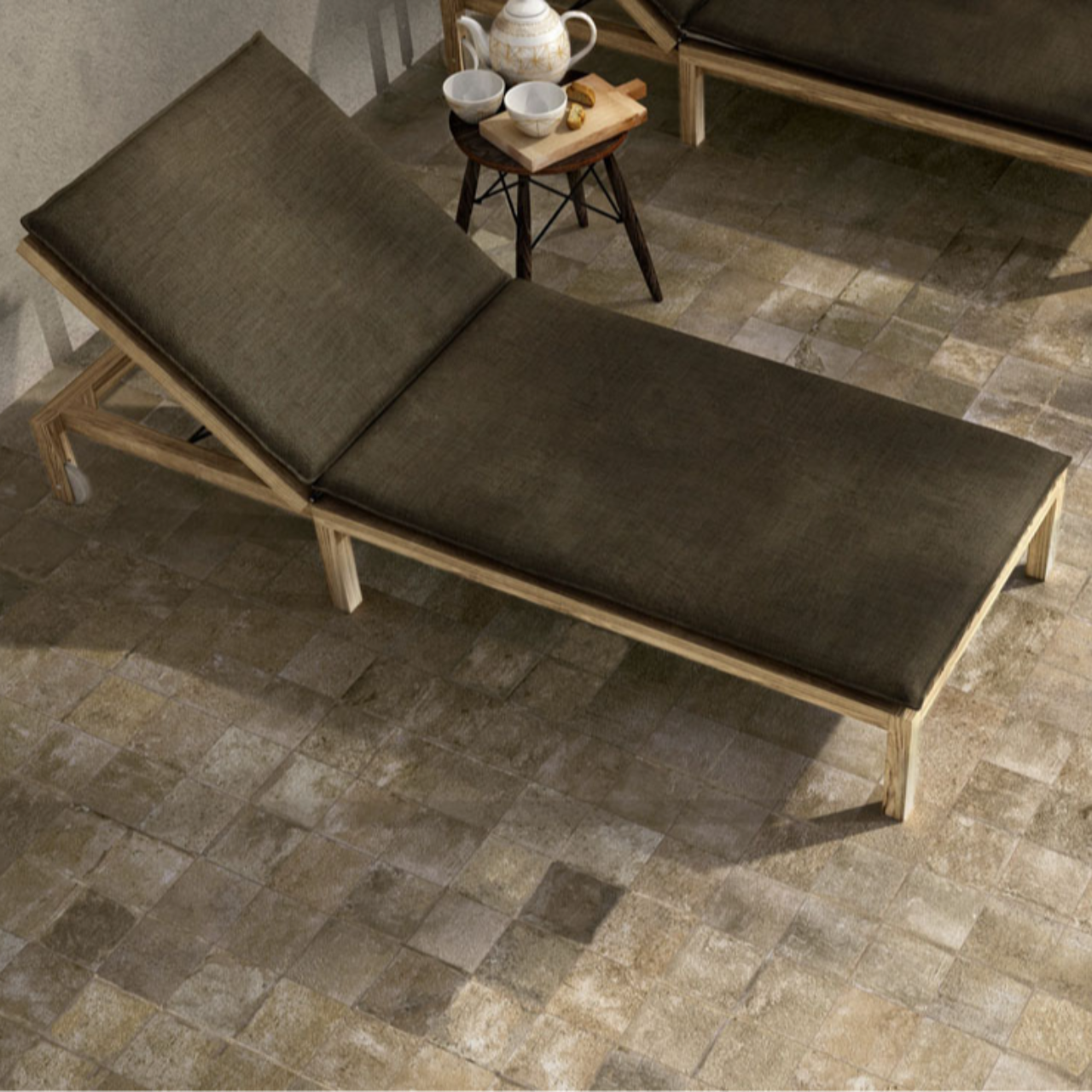 深みのある色むらと素朴な質感が空間に温かみを与え、屋内外問わず使いやすい防滑性の高いタイルです。玄関アプローチやテラス、店舗の床など、滑りにくさとデザイン性を両立した仕上がりが魅力。