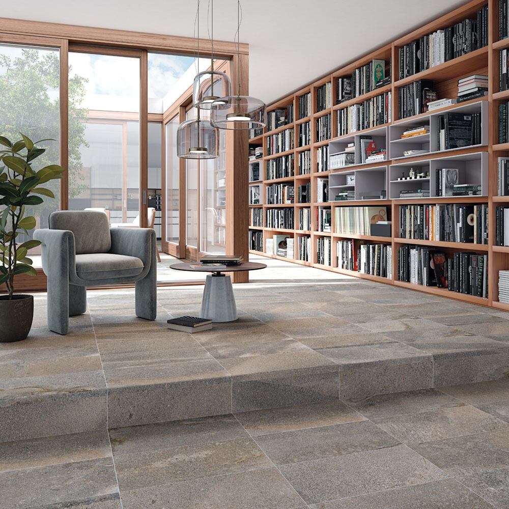 天然石をモチーフにした深い陰影と力強い表情が、空間に重厚感と奥行きを与えます。屋内外の壁・床に使用でき、玄関アプローチやテラス、商業空間のアクセントにも最適。防滑性に優れたラフ仕上げで、外部床でも安心してお使いいただけます。