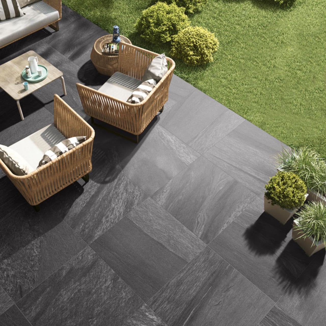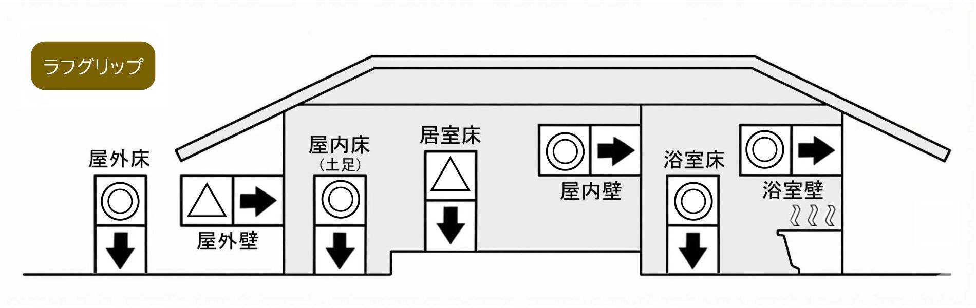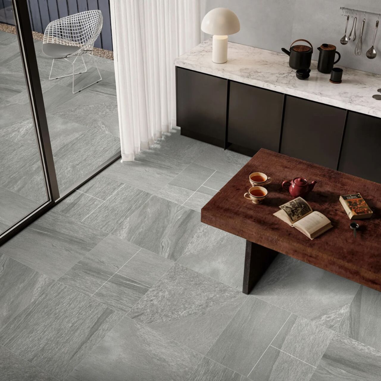 天然石を思わせる深い陰影と質感が空間に重厚感を与え、住宅から商業施設まで幅広く活躍します。防滑性に優れたラフグリップ仕上げで、屋内外の床・壁、アプローチ、バスルームなど水まわりにも安心。